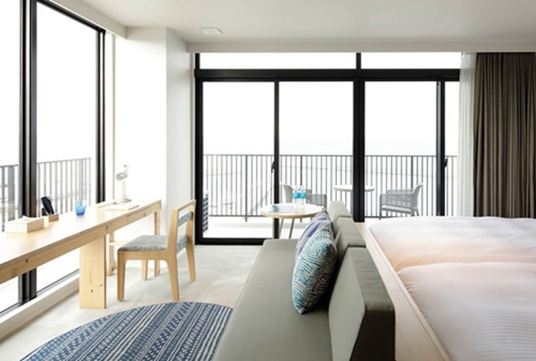 那覇の海の玄関口「とまりん」からすぐの場所にあるホテル。船がいきかうポートビューの館内にアートを施した空間が個性的。